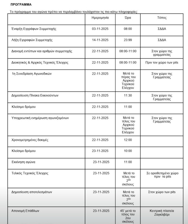 Το πρόγραμμα του αγώνα ξεκινά το Σάββατο 22 Νοεμβρίου με τη διεξαγωγή του καθιερωμένου Διοικητικού & Τεχνικού Ελέγχου από τις 08:00 – 11:00, πριν το χώρο των Pits