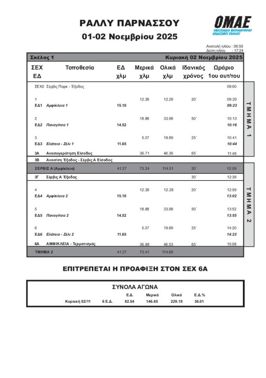 Την Κυριακή 2 Νοεμβρίου, το πρόγραμμα περιλαμβάνει 6 Ειδικές Διαδρομές, συνολικού μήκους 82,54 αγωνιστικών χιλιομέτρων. Τα πληρώματα θα αναχωρήσουν στις 09:00 από το Service Park το οποίο θα εδράζεται στην Αμφίκλεια και θα αγωνιστούν στις 09:23 στην Ειδική Διαδρομή «Αμφίκλεια», μήκους 15,10 χιλιομέτρων. Πρόκειται για μια κλασική ειδική της περιοχής με νέο σχεδιασμό, γρήγορα κομμάτια και τεχνικές στροφές. Η συνέχεια περιλαμβάνει την Ειδική Διαδρομή «Παναγίτσα» (10:16), μήκους 14,52 χιλιομέτρων, η οποία χαρακτηρίζεται από την ομορφιά του τοπίου και τις συνεχείς υψομετρικές αλλαγές. Τελευταία ειδική του πρωινού loop είναι η Ειδική Διαδρομή «Ελάτεια-Ζέλι» με ώρα έναρξης 10:44 και μήκος 11,65 χιλιόμετρα. Πρόκειται για μια ακροπολική, γρήγορη και αγαπημένη ειδική διαδρομή των πληρωμάτων, η οποία αναμένεται να προσελκύσει πλήθος κόσμου. Τα πληρώματα θα κατευθυνθούν στη συνέχεια στο Service Park για ημίωρο Service με το πρόγραμμα να περιλαμβάνει το δεύτερο πέρασμα από την Ειδική Διαδρομή «Αμφίκλεια», με ώρα έναρξης 13:02. Έπειτα τα πληρώματα θα αγωνιστούν και πάλι στην Ειδική Διαδρομή «Παναγίτσα» (13:55), ενώ Power Stage του αγώνα αποτελεί η Ειδική Διαδρομή «Ελάτεια-Ζέλι», η οποία θα ξεκινήσει στις 14:23. Ο τερματισμός του 1ου Ράλλυ Παρνασσού θα λάβει χώρα στην Αμφίκλεια στις 15:08, ενώ η Απονομή των Επάθλων θα διεξαχθεί στις 17:30 στο Πνευματικό Πολιτιστικό Κέντρο Αμφίκλειας.