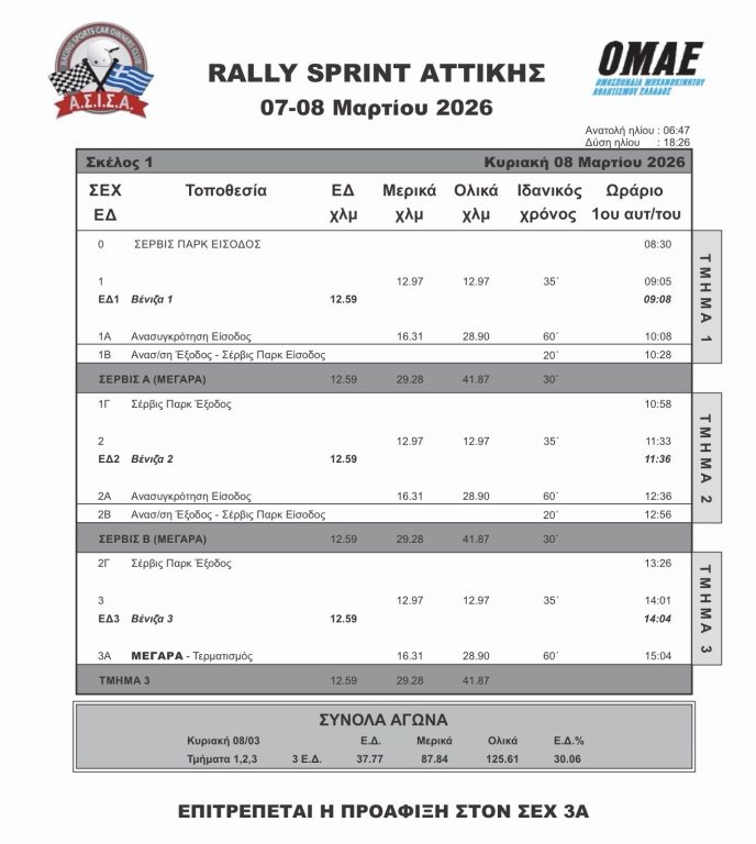 Σας περιμένουμε όλους το Σάββατο 7 Μαρτίου (15:00 – 20:00) στο Ιδιωτικό ΚΤΕΟ «ΚΟΜΒΟΣ» (Γρανικού 2, Μαρούσι) για τον διοικητικό και τεχνικό έλεγχο. Ας δώσουμε την ευκαιρία στους φίλους του αθλήματος να θαυμάσουν από κοντά τα 50 αγωνιστικά «θηρία» πριν πάρουν τις θέσεις τους στην εκκίνηση της Κυριακής!