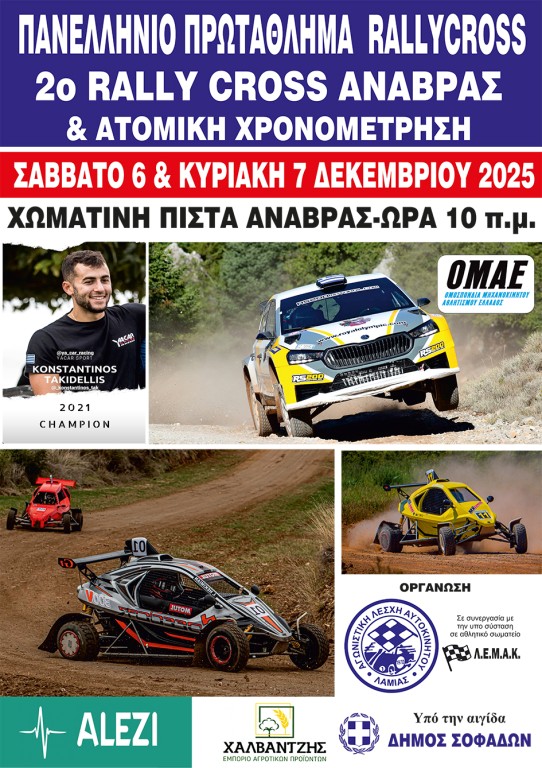 Η Α.Λ.Α.Λαμίας, ανακοινώνει την έναρξη της περιόδου δηλώσεων συμμετοχής για το 2ο Rally Cross Ανάβρας, αγώνα που διοργανώνει σε συνεργασία με την ΛΕΜΑΚ, έτοιμο να προσφέρει ένα ακόμη πιο εντυπωσιακό αγωνιστικό διήμερο. Οι δηλώσεις συμμετοχής υποβάλλονται μέσω της πλατφόρμας e-omae-epa.gr, έως και την Παρασκευή 28 Νοεμβρίου 2025 στις 23:59.