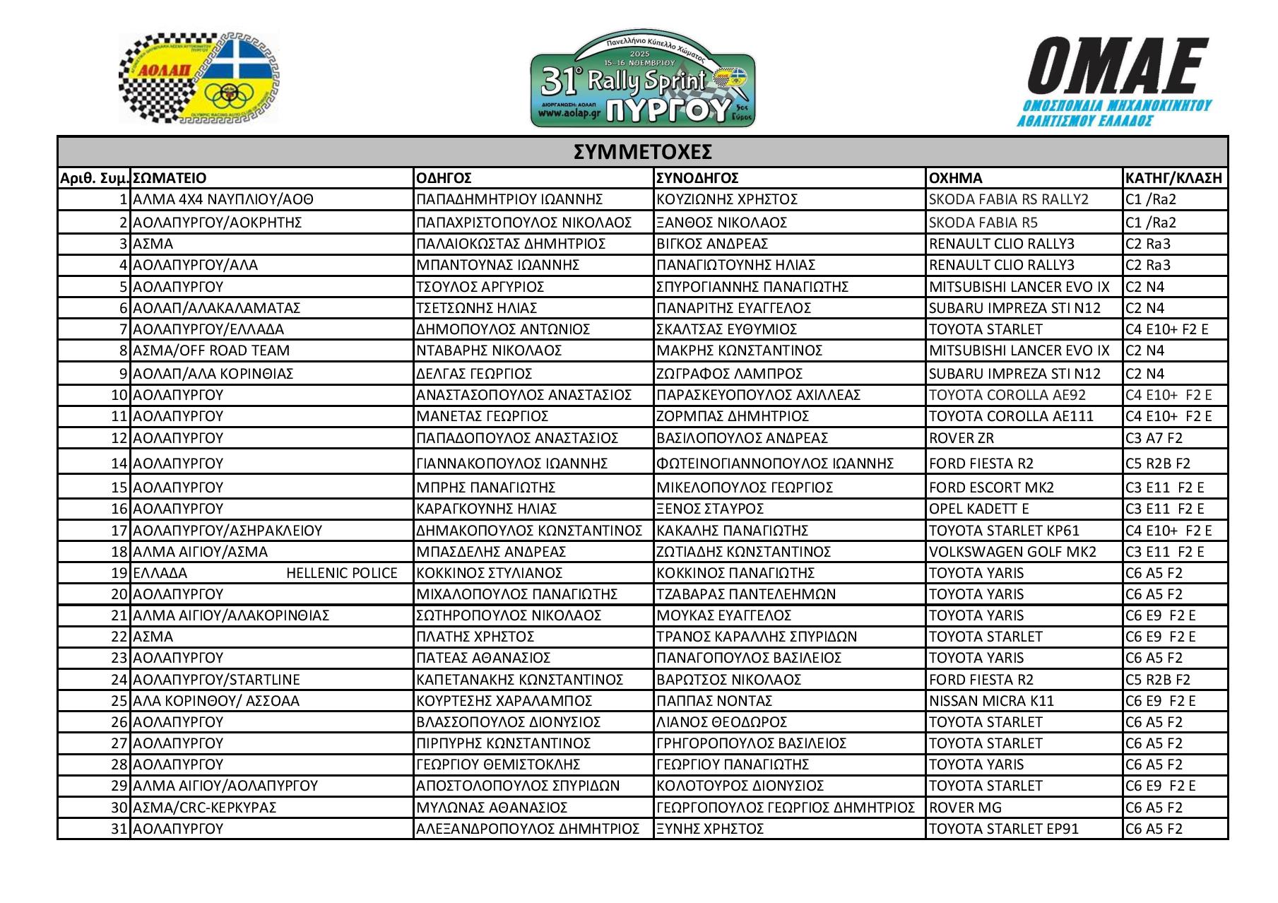Έχοντας κατακτήσει για τρίτη φορά στην καριέρα του το Πανελλήνιο Πρωτάθλημα Ράλλυ, ο Ιωάννης Παπαδημητρίου επιστρέφει στα αγαπημένα του χώματα με στόχο να απολαύσει τον αγώνα και να προσφέρει θέαμα στους θεατές. Μετρώντας τρεις νίκες στο ενεργητικό του σε Ράλλυ Σπριντ της ΑΟΛΑΠ (2008, 2019, 2013), θα έχει στο δεξί μπάκετ ενός Skoda Fabia RS Rally2 τον Χρήστο Κουζιώνη, δις Πρωταθλητή Ελλάδας στους συνοδηγούς. Με το Νο 2 στις πόρτες και τα παράθυρα ενός Skoda Fabia R5 οι Νίκος Παπαχριστόπουλος-Νίκος Ξανθός, θα πραγματοποιήσουν την πρώτη τους εμφάνιση με ένα αυτοκίνητο προδιαγραφών Rally2. Αν και τα αυτοκίνητα της κατηγορίας C1 δεν προσμετρούν στο Κύπελλο Χώματος, οι πρωτοπόροι του θεσμού ευελπιστούν σε έναν συνδυασμό αποτελεσμάτων που θα τους διατηρήσει στην κορυφή και θα τους χαρίσει τον φετινό τίτλο. Έναν τίτλο τον οποίο διεκδικούν και οι Δημήτρης Παλαιοκώστας-Ανδρέας Βίγκος, ένα μήνα μετά τη νίκη τους στο Ράλλυ Σπριντ Λιβαδειάς, που αποτέλεσε τον τέταρτο γύρο του θεσμού. Με ένα Renault Clio Rally3 θα κυνηγήσουν τη νίκη, η οποία αυτομάτως θα τους αναδείξει Κυπελλούχους για το 2025. Ο πολυνίκης των Ράλλυ Σπριντ της ΑΟΛΑΠ, Ιωάννης Μπαντούνας, με πέντε νίκες στο ενεργητικό του, επιστρέφει στη δράση στο τιμόνι ενός Renault Clio Rally3, έχοντας δίπλα του τον Ηλία Παναγιωτούνη. Ο Πρωταθλητής Ελλάδος του 2019 στοχεύει για ακόμη μία φορά στη νίκη, σε μια ειδική διαδρομή την οποία γνωρίζει από τη συμμετοχή του στο Ολυμπιακό Ράλλυ τον περασμένο Απρίλιο.