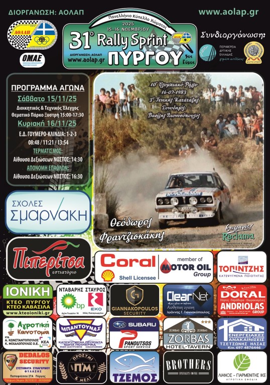 Το 31ο Ράλλυ Σπριντ Πύργου ο πέμπτος και τελευταίος γύρος του Κυπέλλου Ράλλυ Χώματος της φετινής χρονιάς συγκέντρωσε 30 συμμετοχές. Ο αγώνας που θα διεξαχθεί το διήμερο 15 και 16 Νοεμβρίου, διοργανώνεται από το αθλητικό Σωματείο Αγωνιστική Ολυμπιακή Λέσχη Αυτοκινήτου Πύργου (ΑΟΛΑΠ), με συνδιοργανωτή την Περιφέρεια Δυτικής Ελλάδας- Περιφερειακή Ενότητα Ηλείας και την υποστήριξη του Δήμου Πύργου. Θεσμικοί υποστηρικτές είναι το Επιμελητήριο Ηλείας, ο Εμπορικός Σύλλογος Πύργου «Ερμής» και ο ΔΕΠ ΑΕ ΟΤΑ Πύργου.