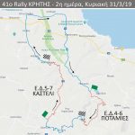 Την Κυριακή 31 Μαρτίου ακολουθούν με 2 περάσματα η καθεμιά, οι ειδικές 4,6 Ποταμιές-Ασκοί στις 11:13 και 13:32 και 5,7 Καστέλι-Καλό Χωριό 11:46 και 14:05 με την καρό σημαία να πέφτει στις 14:50 στην πλατεία Ελευθερίας.