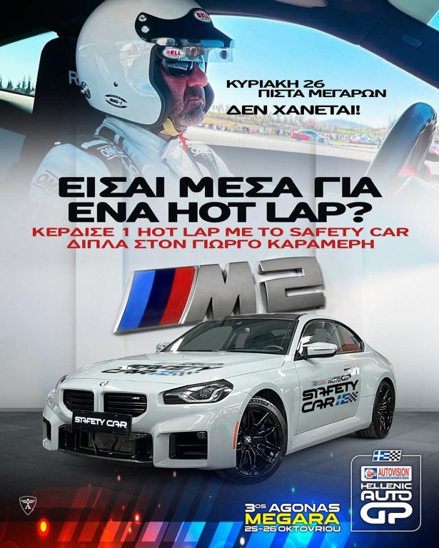Το AUTOVISION Hellenic Auto GP δίνει μια μοναδική ευκαιρία σε τρείς τυχερούς θεατές να καθίσουν στο δεξί κάθισμα του BMW M2 της Sportcar Tech, που χρησιμοποιείται ως Safety Car και να ζήσουν την μοναδική εμπειρία της συνοδήγησης με τον Γιώργο Καραμέρη.