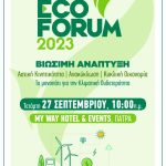 Ο όμιλος Plusmedia σε συνδιοργάνωση με την Περιφέρεια Δυτικής Ελλάδος, την Περιφερειακή Ένωση Δήμων Δυτικής Ελλάδας, το Τεχνικό Επιμελητήριο Ελλάδος Τμήμα Δυτικής Ελλάδας, το Επιμελητήριο Αχαΐας, το 10ο Περιφερειακό Τμήμα Β.Δ. Πελοποννήσου & Δυτικής Ελλάδας του Οικονομικού Επιμελητηρίου Ελλάδος, τον ΣΥΔΙΣΑ Αχαΐας, τον Δήμο Ερυμάνθου και την Πύρωση ΑΜΚΕ πραγματοποιούν στην Πάτρα, το ECOFORUM 2023 με κεντρικό θέμα: «Βιώσιμη Ανάπτυξη: Αστική Κινητικότητα – Ανακύκλωση – Κυκλική Οικονομία. Το μονοπάτι για την Κλιματική Ουδετερότητα» το οποίο θα διεξαχθεί την Τετάρτη 20 Σεπτεμβρίου, 10.00 – 16.00, στο My Hotel Πατρας. Το συνέδριο τελεί υπό την αιγίδα του Υπουργείου Μεταφορών.