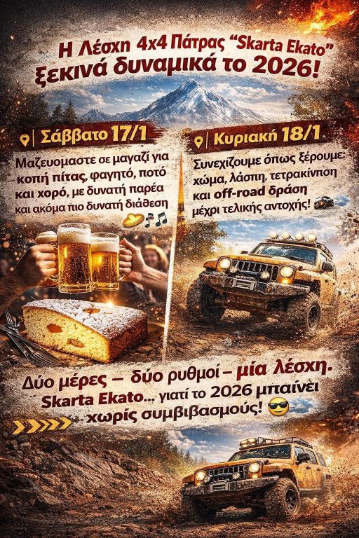Το Αθλητικό Σωματείο “Λέσχη 4×4 Πάτρας – Skarta Ekato” προσκαλεί όλα τα μέλη αλλά και τους φίλους του στην κοπή της Πρωτοχρονιάτικης Πίτας το Σάββατο 17 Ιανουαρίου 2026 και ώρα 21:00 στο Κέντρο “ΔΙΑΚΟΥ”