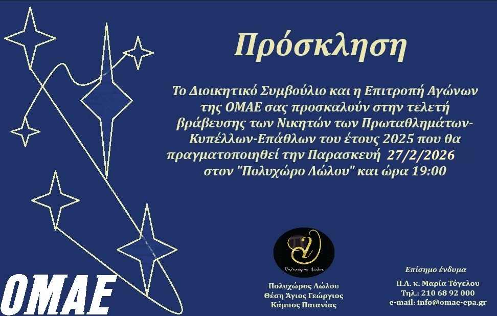 Η ΟΜΑΕ, λαμβάνοντας υπόψη και σεβόμενη την επιθυμία των αθλητών, αποφάσισε τη μεταβολή της ημερομηνίας διεξαγωγής της τελετής απονομής. Η τελετή βράβευσης των νικητών των Πρωταθλημάτων-Κυπέλλων-Επάθλων του έτους 2025 θα πραγματοποιηθεί την Παρασκευή 27 Φεβρουαρίου 2026 και ώρα 19:00 στον Πολυχώρο Λώλου.