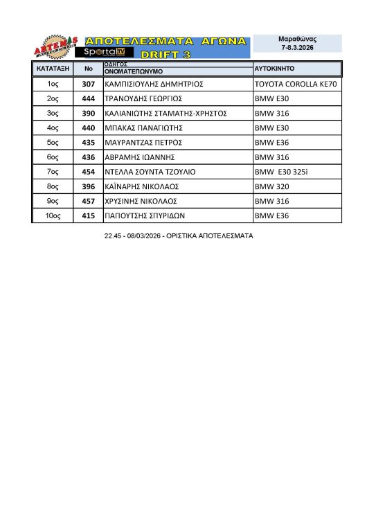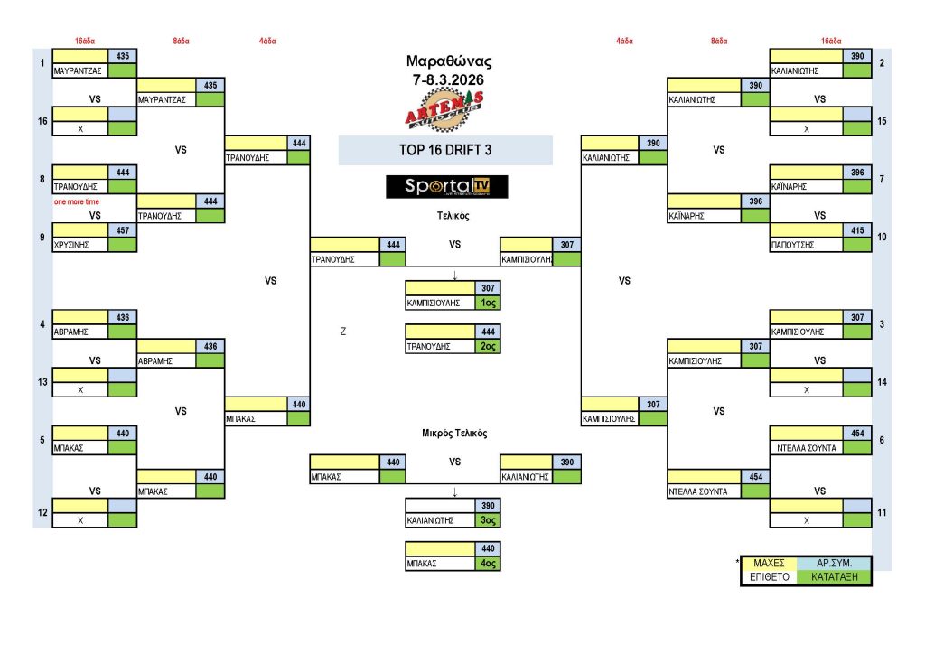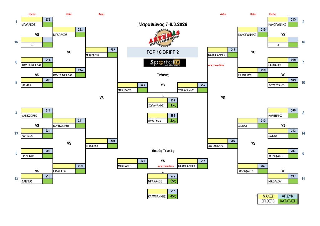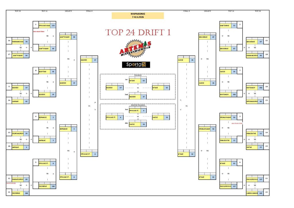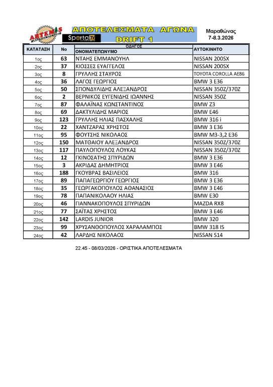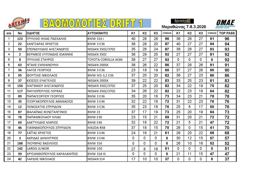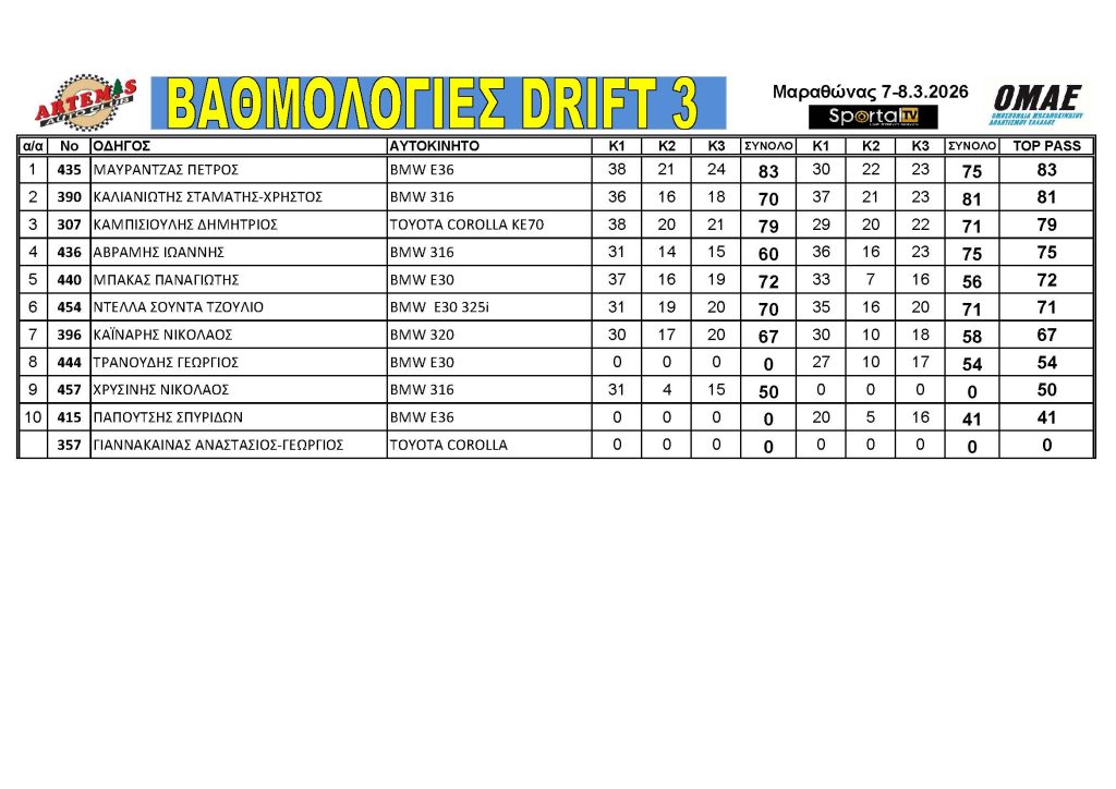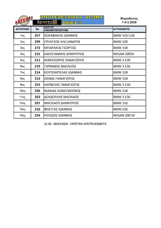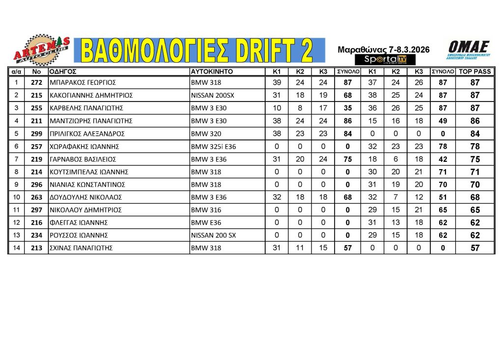 Το Αθλητικό Σωματείο ARTEMIS, με συνδιοργανωτή το SPORTAL TV, μετά την απαραίτητη έγκριση της ΟΜΑΕ (Ομοσπονδίας Μηχανοκίνητου Αθλητισμού Ελλάδος) και της Επιτροπής Drift της ΕΠΑ, διοργάνωσαν τον 1ο γύρο του Πανελληνίου Πρωταθλήματος Drift 2026 το Σάββατο 07 και την Κυριακή 08 Μαρτίου 2026 στον Μαραθώνα, υπό την αιγίδα του Δήμου Μαραθώνα και την υποστήριξη του Γραφείου Αθλητισμού του Δήμου Μαραθώνα.