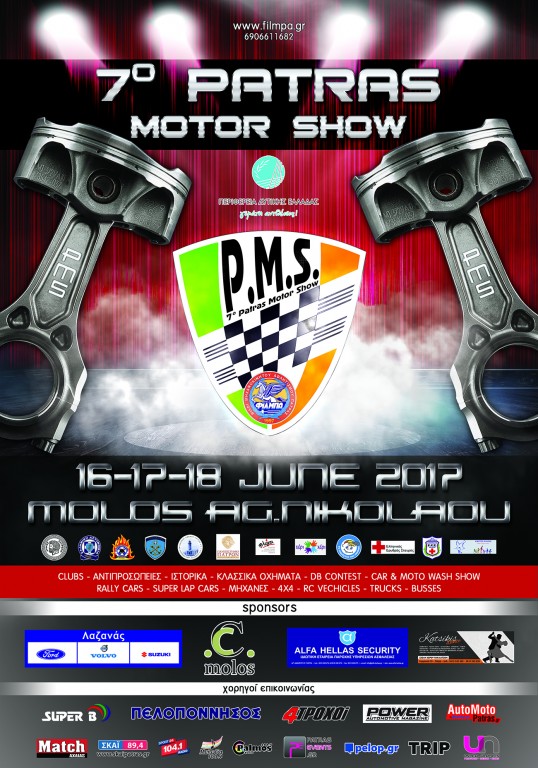 [vc_row el_class=”td-ss-row”][vc_column width=”2/3″][td_block_text_with_title custom_title=”7ο Patras Motor Show”]Η ΦΙΛ.Μ.Π.Α (Φίλοι Μηχανοκίνητου Αθλητισμού Πάτρας), Σωματείο μη Κερδοσκοπικού Χαρακτήρα, διοργανώνει το 7ο P.M.S (Patras Motor Show), στις 16-17-18 Ιουνίου 2017 και πάλι στο Μόλο της Αγίου Νικολάου στην Πάτρα.