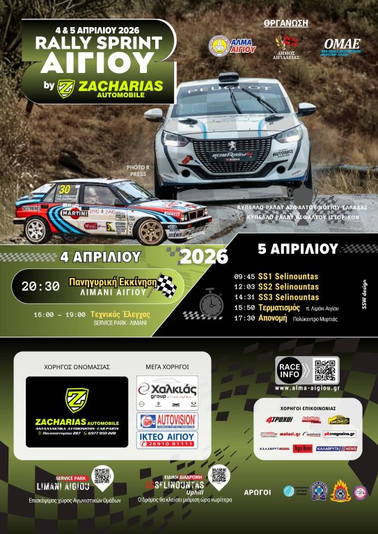Με έντονο αγωνιστικό ενδιαφέρον και αυξημένη συμμετοχή επιστρέφει το Rally Sprint Αιγίου 2026, με χορηγό ονομασίας τη Zacharias Automobile, συγκεντρώνοντας τα βλέμματα φίλων του μηχανοκίνητου αθλητισμού από όλη την Ελλάδα. Ο αγώνας, που προσμετρά στο Κύπελλο Ελλάδος Ράλλυ Ασφάλτου αλλά και στο Κύπελλο Ασφάλτου Ιστορικών Αυτοκινήτων, συγκεντρώνει φέτος 39 συμμετοχές, εγκαινιάζοντας με τον καλύτερο τρόπο τον φετινό θεσμό και υποσχόμενος πλούσιο θέαμα σε κάθε επίπεδο.