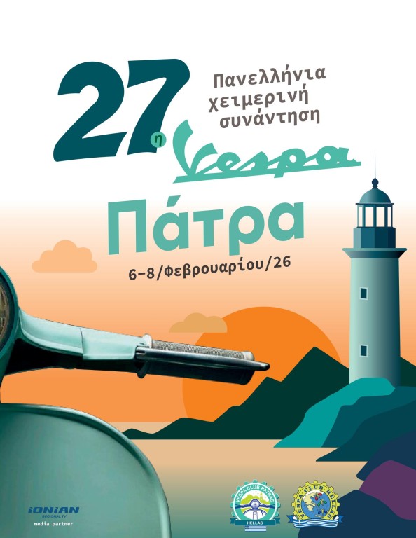 Η Λέσχη Φίλων Βέσπα Πάτρας θα είναι ο τυπικός “οκοδεσπότης” της 27ης Χειμερινής Πανελλήνιας Συνάντησης Vespa. Μια τριήμερη γιορτή για όλους όσους αγαπούν την κλασική αισθητική, το στυλ και την κουλτούρα της Vespa!