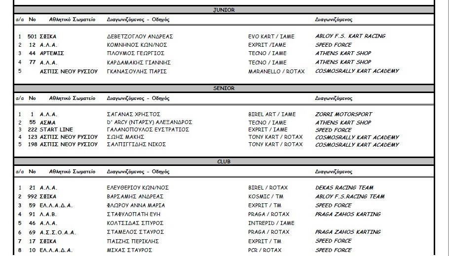 Στην Senior και στην Junior συμμετέχουν μόλις 5 αθλητές ενώ στην Club θα πάρουν μέρος 8 οδηγοί.