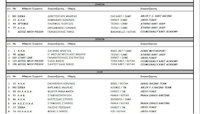 Οι συμμετοχές στον 4ο αγώνα του Πανελληνίου Πρωταθλήματος Karting