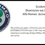 Ο Σύλλογος Ιδιοκτητών και κατόχων Alfa Romeo Δυτικής Ελλάδος, καλεί τους φίλους και τα μέλη του, την Κυριακή 29/09/2024 και ώρα 11:00 στην περιοχή του Αγρινίου, στο παραλίμνιο κατάστημα ΚΤΗΜΑ ΠΙΘΑΡΙ.