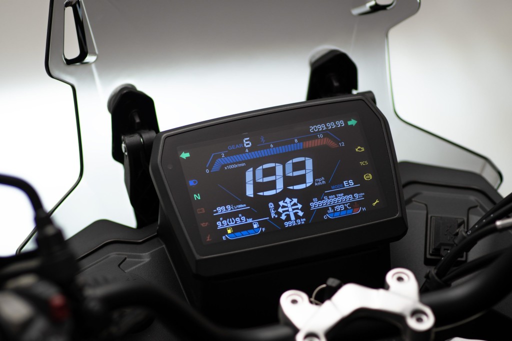 Η έγχρωμη οθόνη 8” υψηλής ανάλυσης προσφέρει ευκολότερη ανάγνωση κάτω από κάθε συνθήκη και ακόμα περισσότερη πληροφόρηση στον αναβάτη, με ενδείξεις που περιλαμβάνουν από τη λειτουργική κατάσταση του ABS και του Traction Control μέχρι τις πιέσεις των ελαστικών. Μέσω τεχνολογίας bluetooth συνδέεται με το κινητό του αναβάτη προσφέροντας έως και πλοήγηση turn by turn! Εκατέρωθεν αυτής φιλοξενούνται δύο παροχές ρεύματος, μια παραδοσιακή πρίζα 12V και μια θύρα USB!